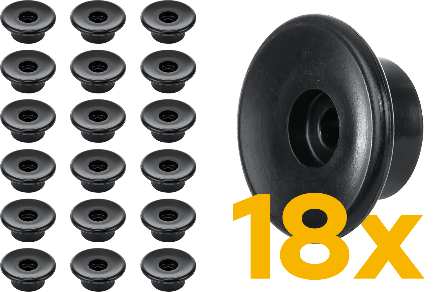 - Sada 18 bočních válečků o průměru 30 mm pro přívěsy automobilů a dodávky. Určeno k upevnění krytů, sítí a plachet k bočnici pomocí elastického lana.