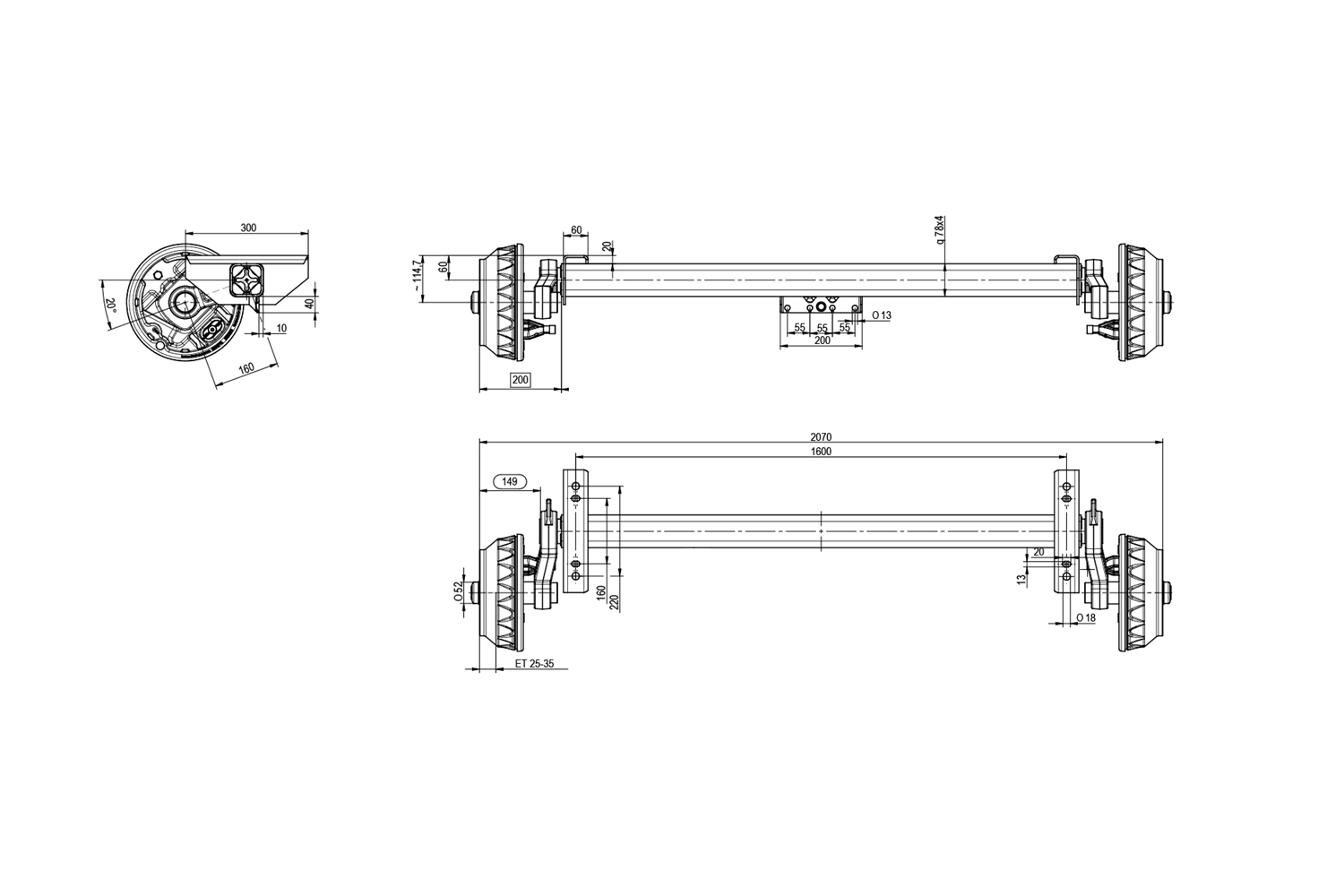 Brzděná náprava KNOTT je určena pro těžké přívěsy nebo odtahové vozy s maximální nosností 1800 kg pro jednu nápravu a 3500 kg pro tandemovou nápravu. Rozteč montážních otvorů je 1600 mm, rozteč nábojů je 2070 mm, což umožňuje snadnou montáž do široké škály vozidel. Vzor šroubů 5x112 zajišťuje kompatibilitu s většinou kol dostupných na trhu. Délka páky kyvné vidlice je 160 mm, což zajišťuje stabilitu a optimální tlumení nárazů a zvyšuje tak bezpečnost jízdy i při plném zatížení.