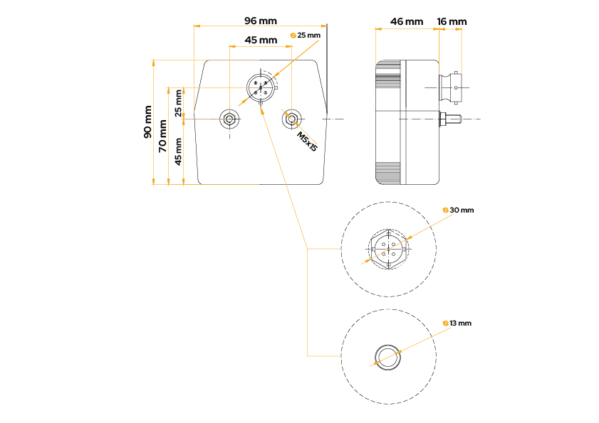 Zadní svítilna MD-002 od FRISTOM je určena pro montáž na levou i pravou stranu vozidla a vyznačuje se následujícími rozměry: šířka 96 mm, výška 90 mm, hloubka 46 mm . Na zadní straně lampy je gumová průchodka , která usnadňuje připojení kabelu, takže je ideální pro použití v přívěsech a dodávkách .