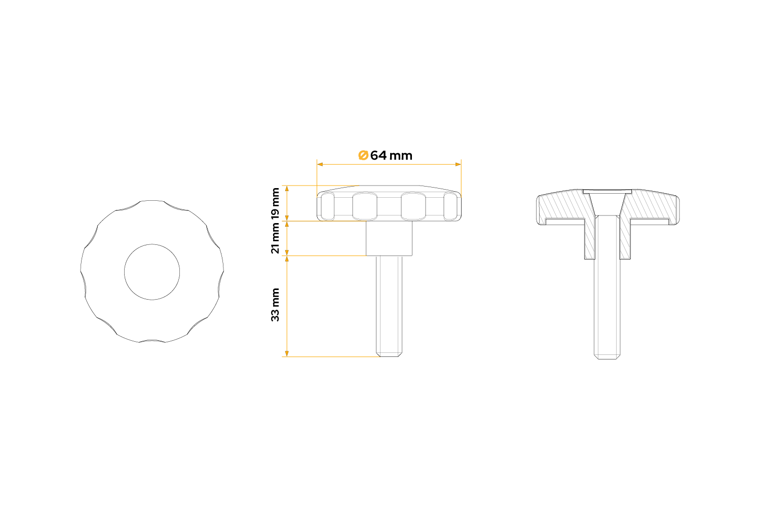 Zesílená hvězdicová rukojeť POK-03 M10x33 (s vnějším závitem) je robustní upevňovací prvek pro zajištění ramp během přepravy bez použití nářadí. Její střední část je opatřena šroubem M10 se závitem 33 mm zapuštěným do plastu, což usnadňuje montáž a demontáž a zajišťuje stabilitu spojení. Ergonomický tvar „hvězdy“ usnadňuje bezpečný úchop i v rukavicích a průměr rukojeti 64 mm umožňuje vyvíjet dostatečný tlak k zajištění součástí během jízdy.
