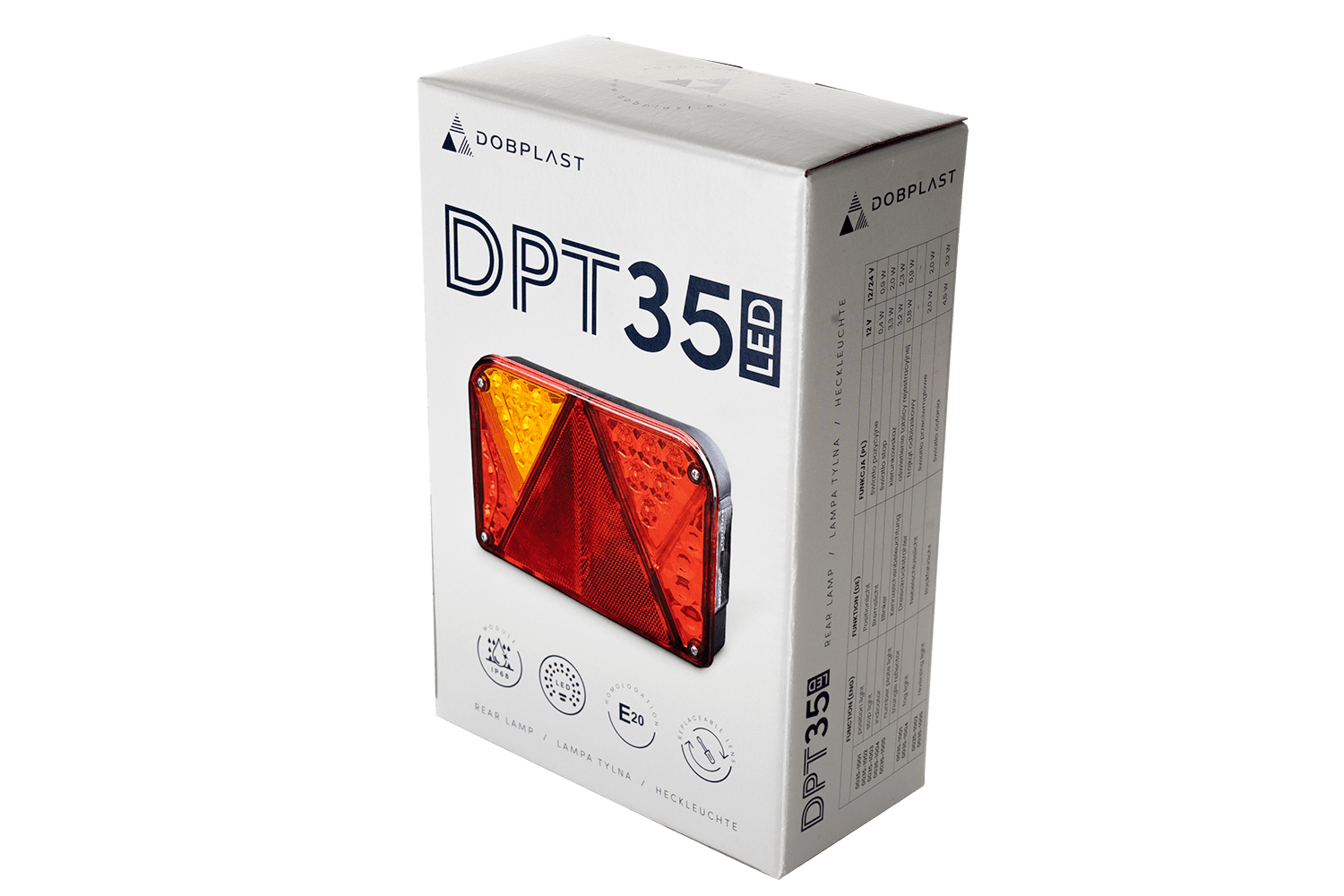 - Zadní světlo DPT35 LED DOBPLAST je určeno pro montáž na pravou stranu. Nabízí šest funkcí: obrysové světlo, brzdové světlo, couvací světlo, směrové světlo, osvětlení registrační značky a reflexní trojúhelník.
