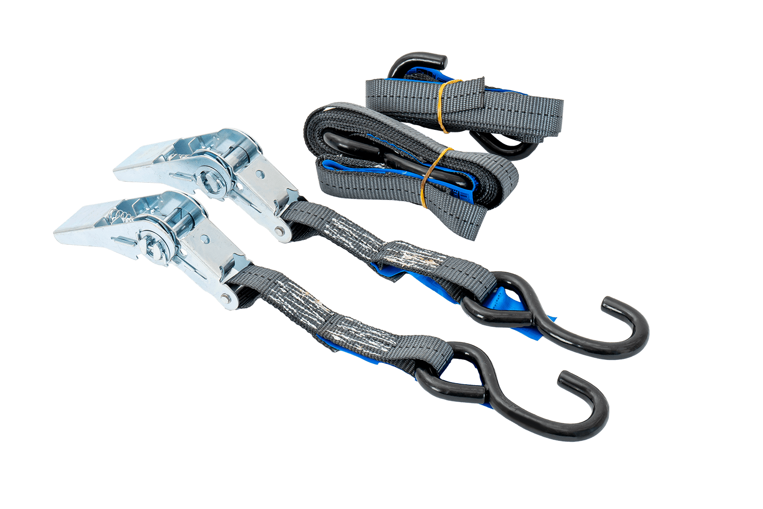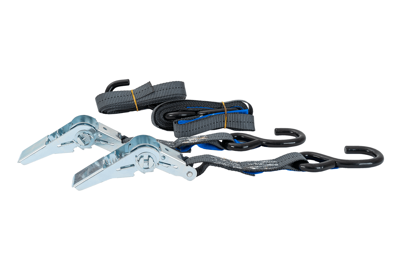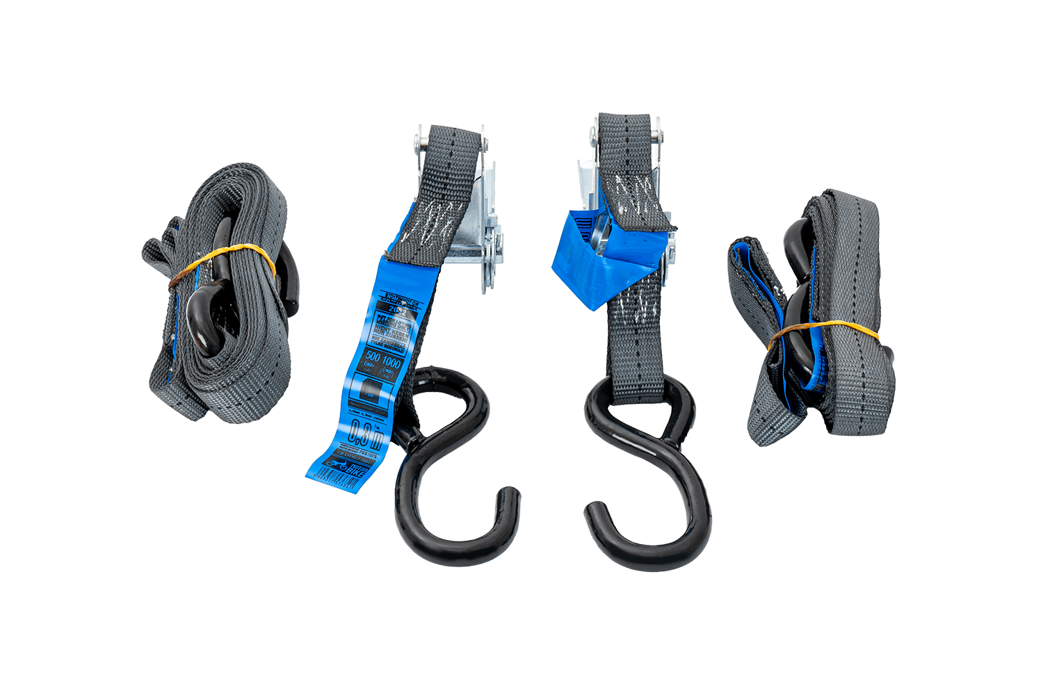 Tato sada dvou přepravních popruhů HILLS a dvou úvazků představuje kompletní řešení pro zajištění motocyklu. Každý šedý přepravní popruh se skládá ze dvou částí: kratší s ráčnovým napínačem a hákem a delší popruh, rovněž s hákem. Celková délka popruhu včetně přezky je 3 metry a šířka 25 mm poskytuje dostatečnou upínací plochu. Popruhy mají pevnost v tahu 1 tuna (1000 daN) , což je v kombinaci se dvěma popruhy o délce 0,45 metru ideální pro bezpečnou přepravu motocyklu na přívěsu nebo v dodávce. Ráčna umožňuje rychlé a snadné zajištění motocyklu a minimalizuje riziko posunutí nebo poškození během přepravy. Popruhy s očky navíc poskytují ještě větší stabilitu při montáži, díky čemuž je tato sada ideální volbou pro bezpečnou přepravu motocyklu.