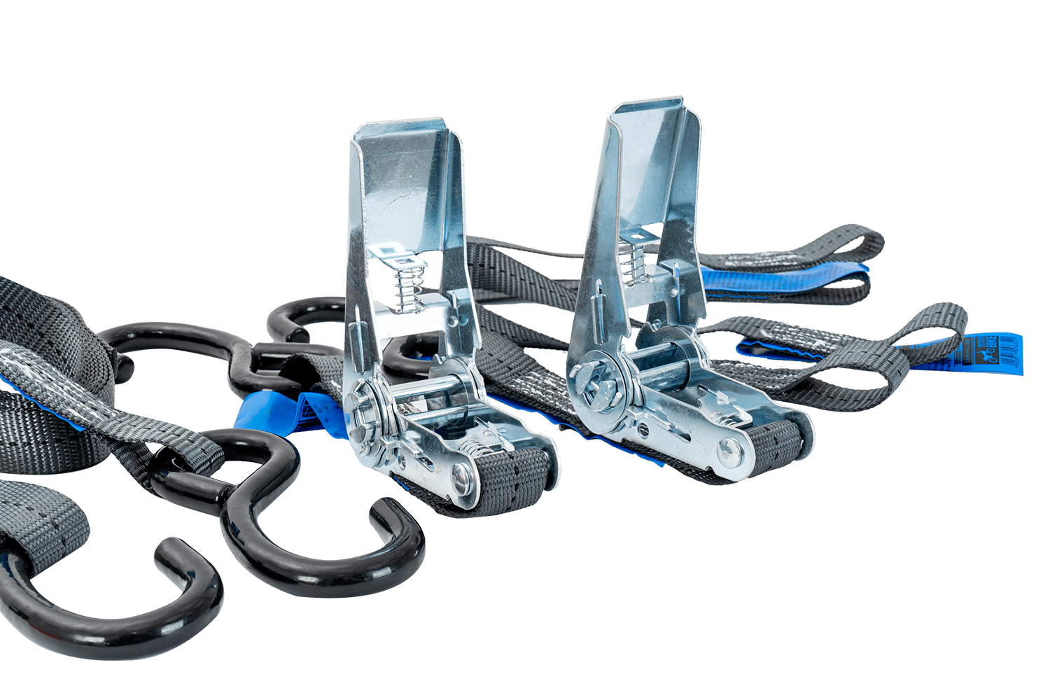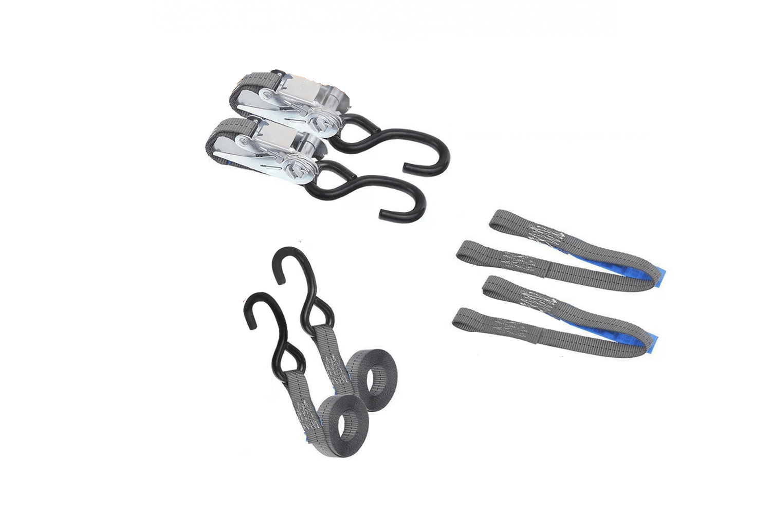 - Sada dvou popruhů a dvou úvazků pro zajištění motocyklu HILLS o hmotnosti 1 tuny. Celková délka popruhů s ráčnami je 3 metry a úvazky mají délku 0,45 metru.