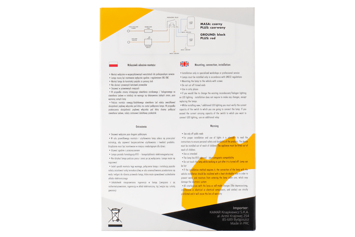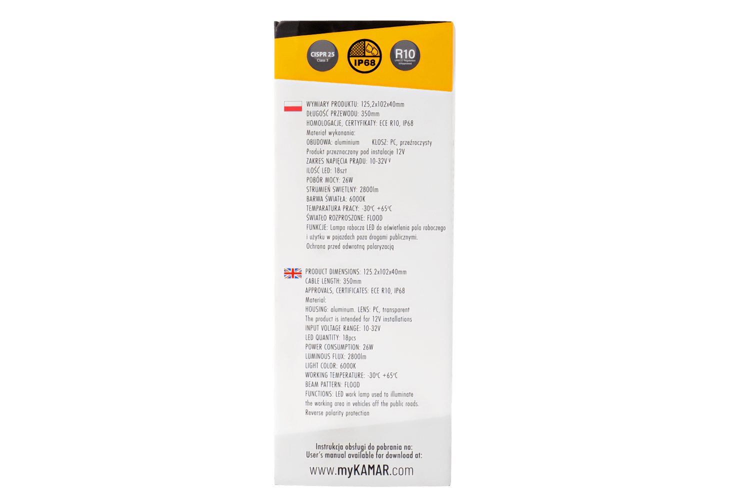 Lampa má navíc certifikát R10 , který potvrzuje její shodu s požadavky Evropské unie v oblasti bezpečnosti používání a elektromagnetické kompatibility. Certifikát R10 potvrzuje, že zařízení nezpůsobuje elektronické rušení a lze jej bezpečně používat ve vozidlech s elektrickými instalacemi.