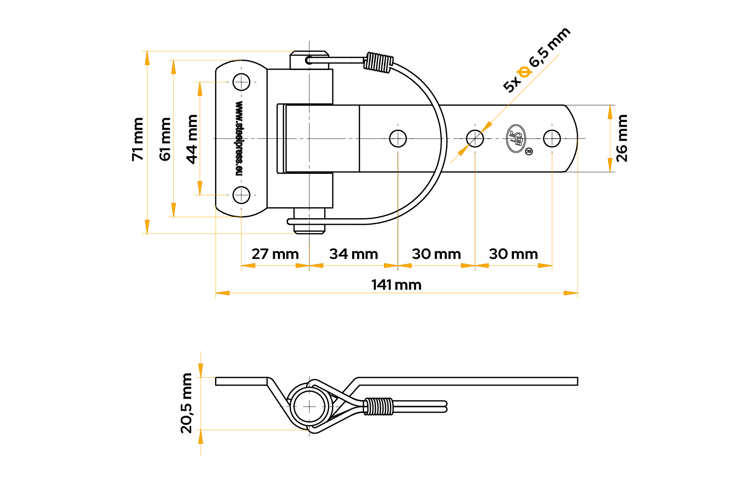 Boční pant ZW-03.106 od společnosti STEELPRESS je robustní a odolný hardwarový prvek určený pro montáž bočních panelů na nákladní, zemědělské a užitkové přívěsy. Pant je dlouhý 141 mm a široký 71 mm , takže je všestranný a snadno se přizpůsobí různým typům karoserií. Precizní zpracování zajišťuje stabilní chod pantu a usnadňuje otevírání a zavírání bočních panelů, čímž zvyšuje funkčnost celé konstrukce přívěsu.