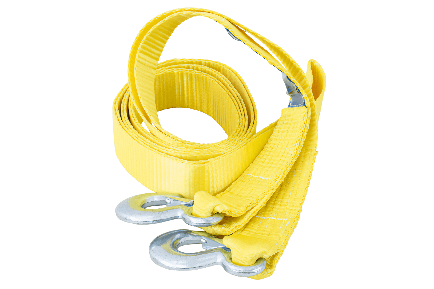 Žlutý tažný popruh UNITRAILER s háky je spolehlivým příslušenstvím pro nouzové odtahování osobních automobilů , dodávkových vozů a lehkých strojů. Pás je vyroben z odolné syntetické pásky o délce 4,5 metru a šířce 50 mm , která zajišťuje dostatečnou pevnost, a je na obou stranách vybaven pevnými kovovými bezpečnostními háky . Maximální tažná síla je 5 tun (5000 kg) , což umožňuje bezpečné a efektivní tažení většiny standardních vozidel.