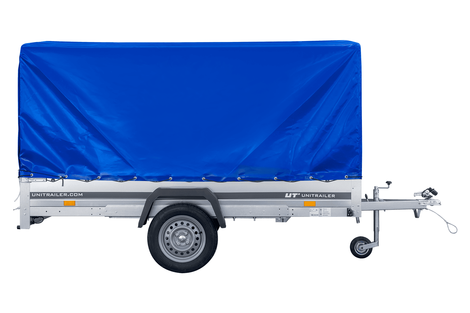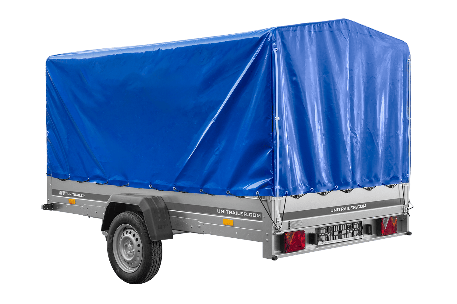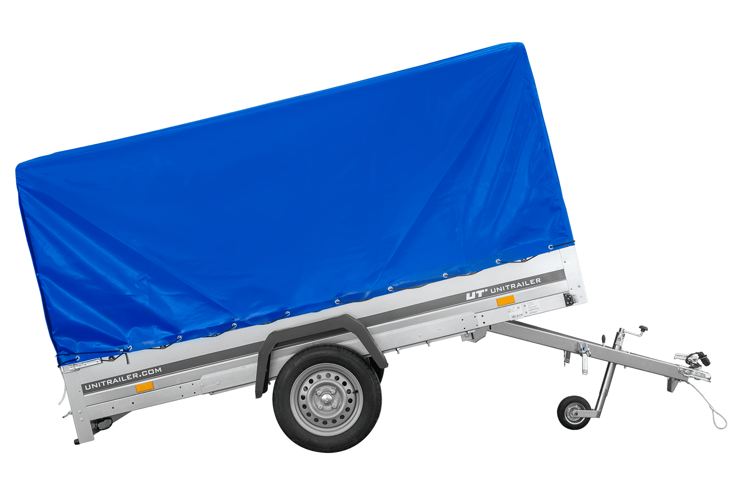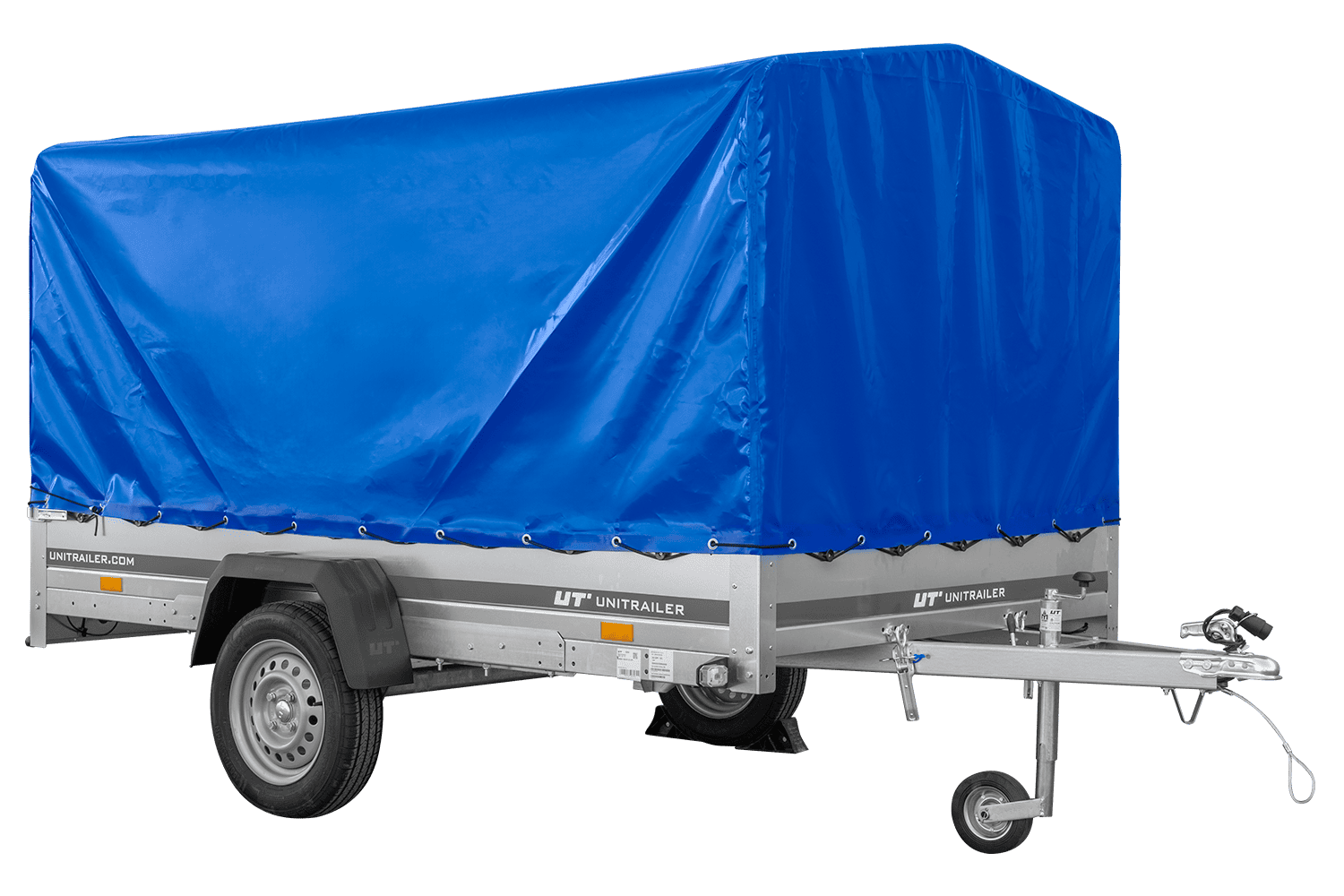 - UNITRAILER Garden 265 Kipp přívěs za auto, šířka 150 cm, s rámem H-1100 a modrým krytem.
