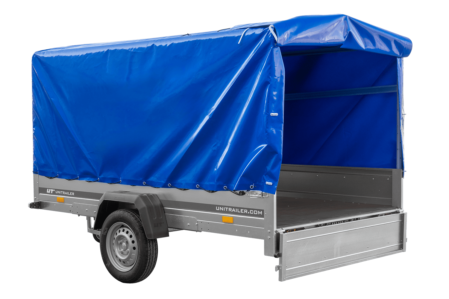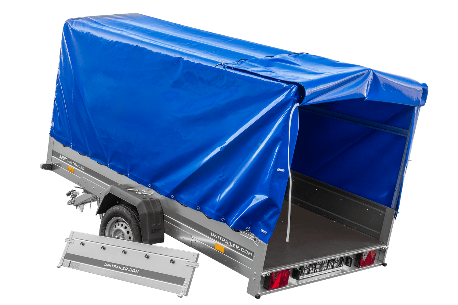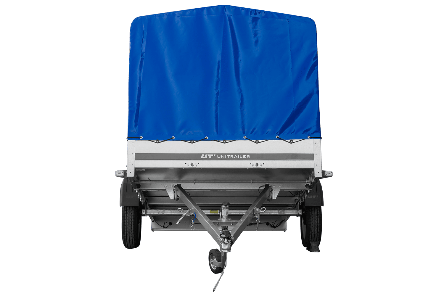 - UNITRAILER Garden 265 Kipp přívěs za auto, šířka 150 cm, s rámem H-1100 a modrým krytem.