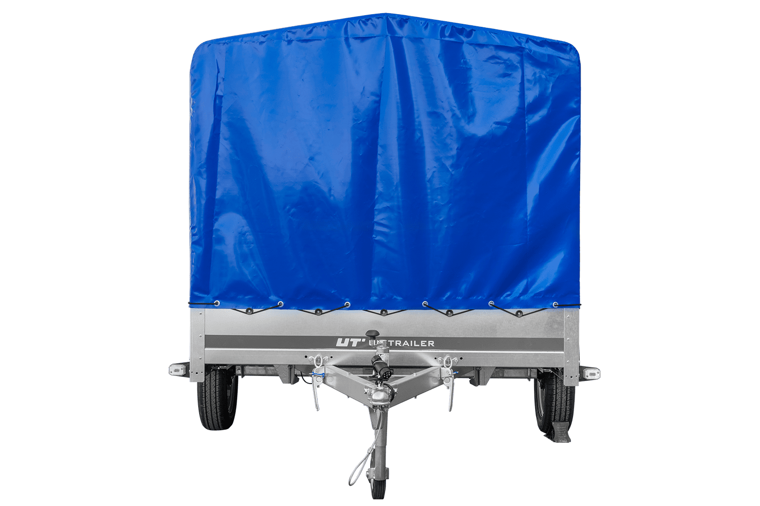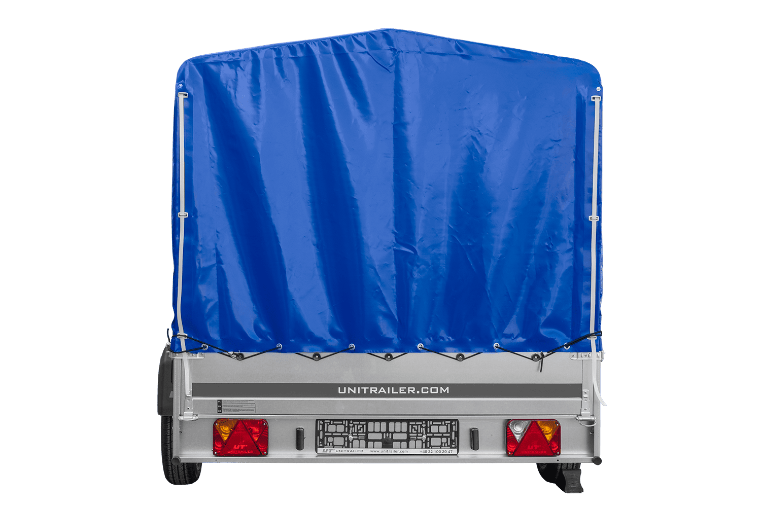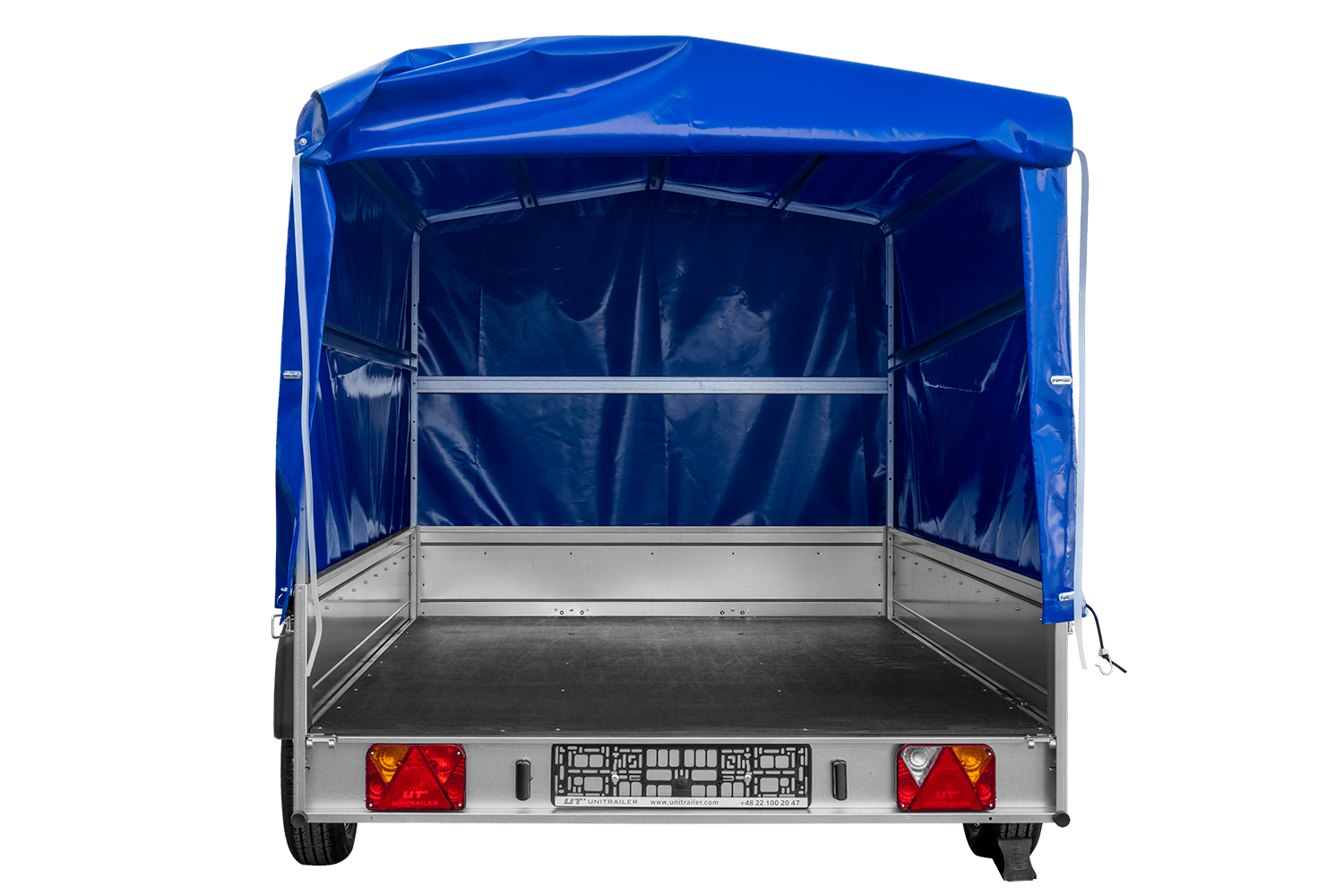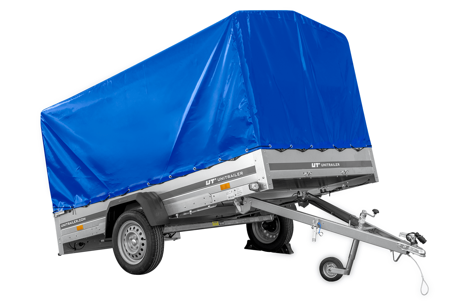 - UNITRAILER Garden 265 Kipp přívěs za auto, šířka 150 cm, s rámem H-1100 a modrým krytem.
