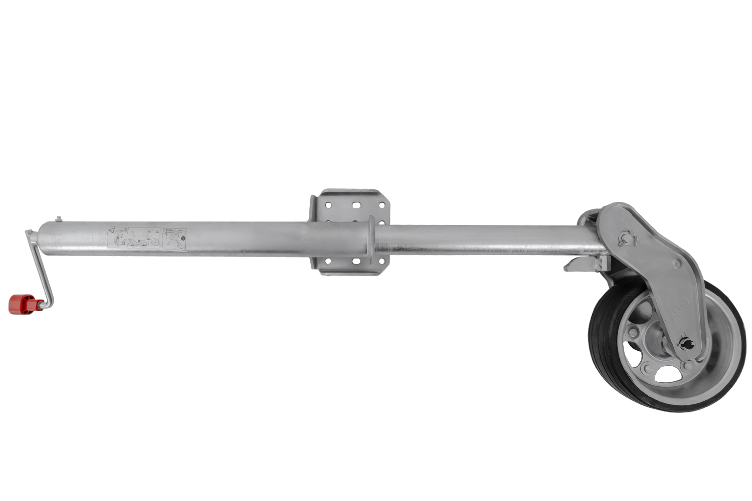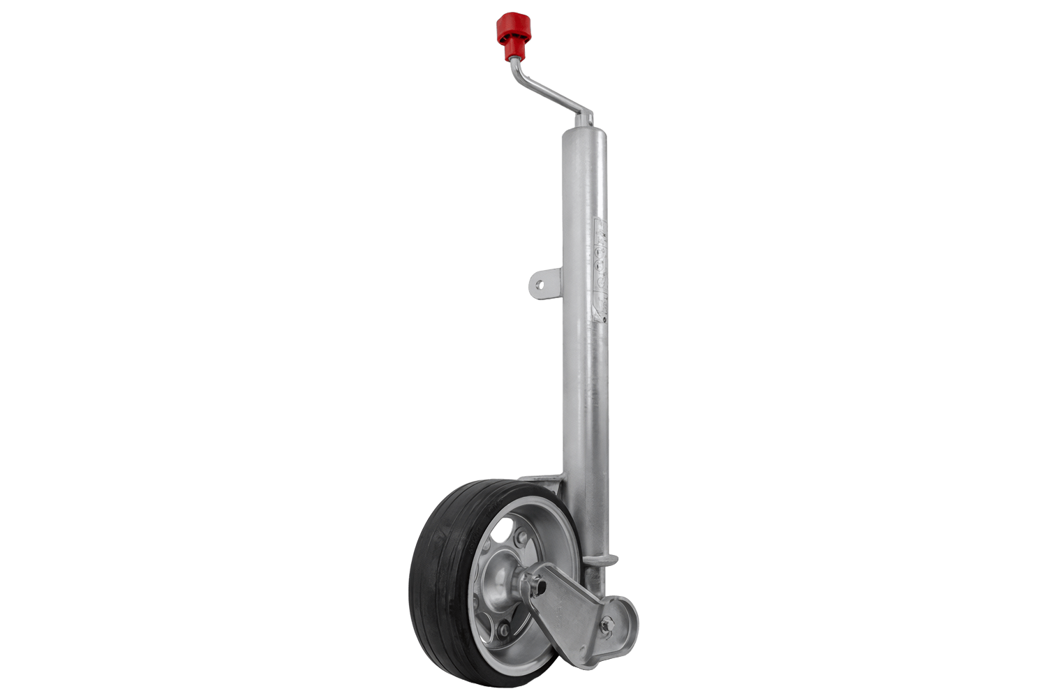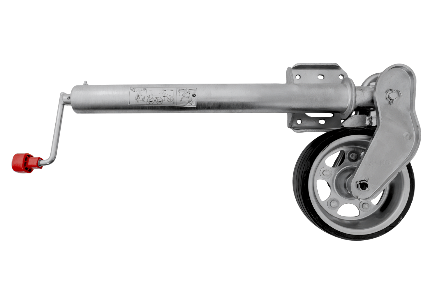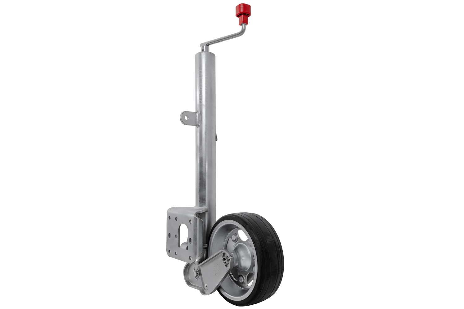 Kolo je žárově zinkované, což ho účinně chrání před korozí a nepříznivými povětrnostními podmínkami. Je vybaveno klikou s axiálním ložiskem , díky čemuž je provoz plynulejší a méně náročný. Mechanismus zvedání kola je plně automatický a vestavěná maznice zajišťuje volnost pohybu a delší životnost. Tento model je prodloužená verze s prodlouženým nastavovacím zdvihem , což usnadňuje přesné nastavení výšky. Deska opěrného kola je navíc hluboce svařena, což zvětšuje prostor pro otáčení opěrné patky během zvedání a zajišťuje větší pohodlí při používání.
