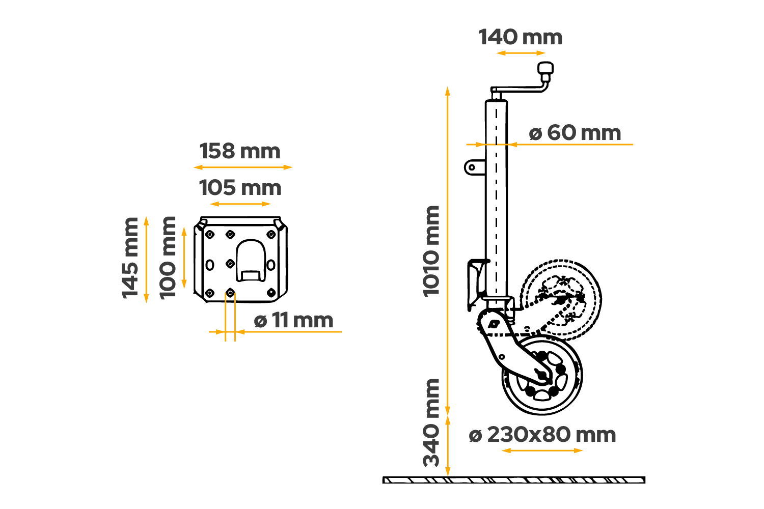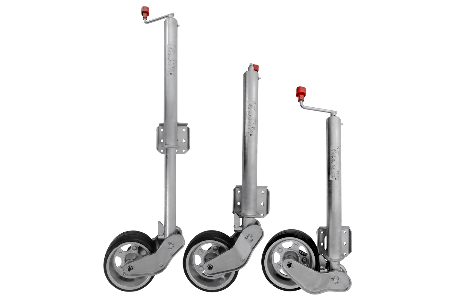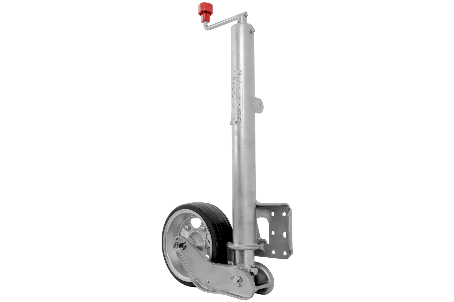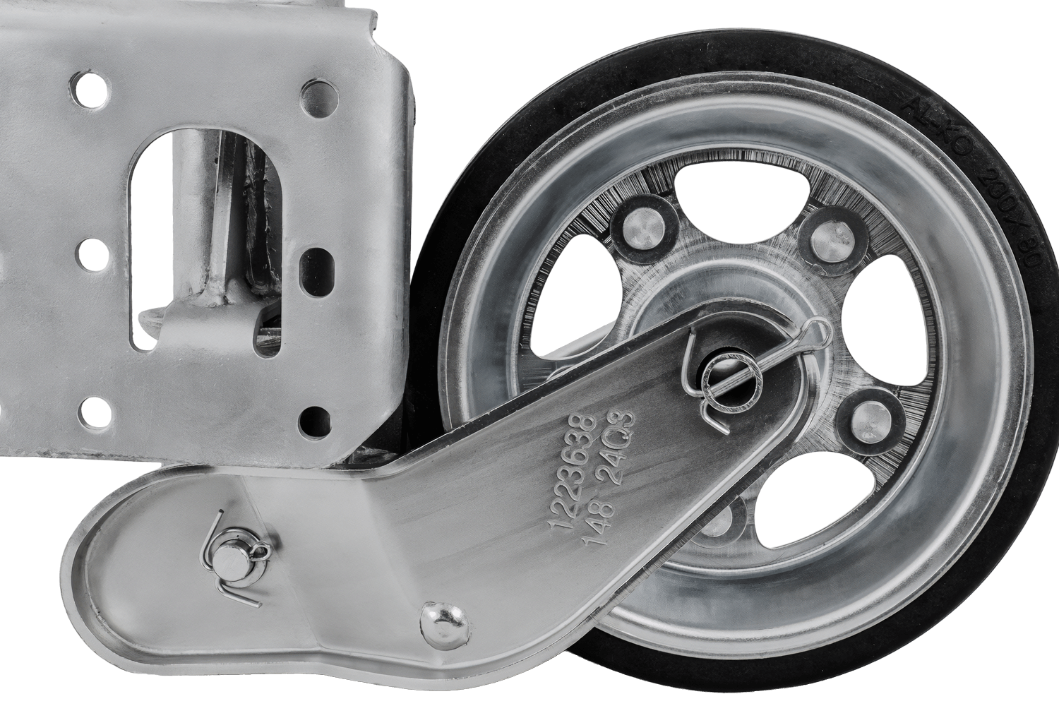 Kolo je žárově zinkované, což ho účinně chrání před korozí a nepříznivými povětrnostními podmínkami. Je vybaveno klikou s axiálním ložiskem , díky čemuž je provoz plynulejší a méně náročný. Mechanismus zvedání kola je plně automatický a vestavěná maznice zajišťuje volnost pohybu a delší životnost. Tento model je prodloužená verze s prodlouženým nastavovacím zdvihem , což usnadňuje přesné nastavení výšky. Deska opěrného kola je navíc hluboce svařena, což zvětšuje prostor pro otáčení opěrné patky během zvedání a zajišťuje větší pohodlí při používání.