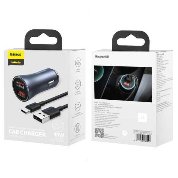 Baseus Golden Pro | Sada rychlonabíječky do auta 2xUSB 40W + USB - Type-C kabel 1m