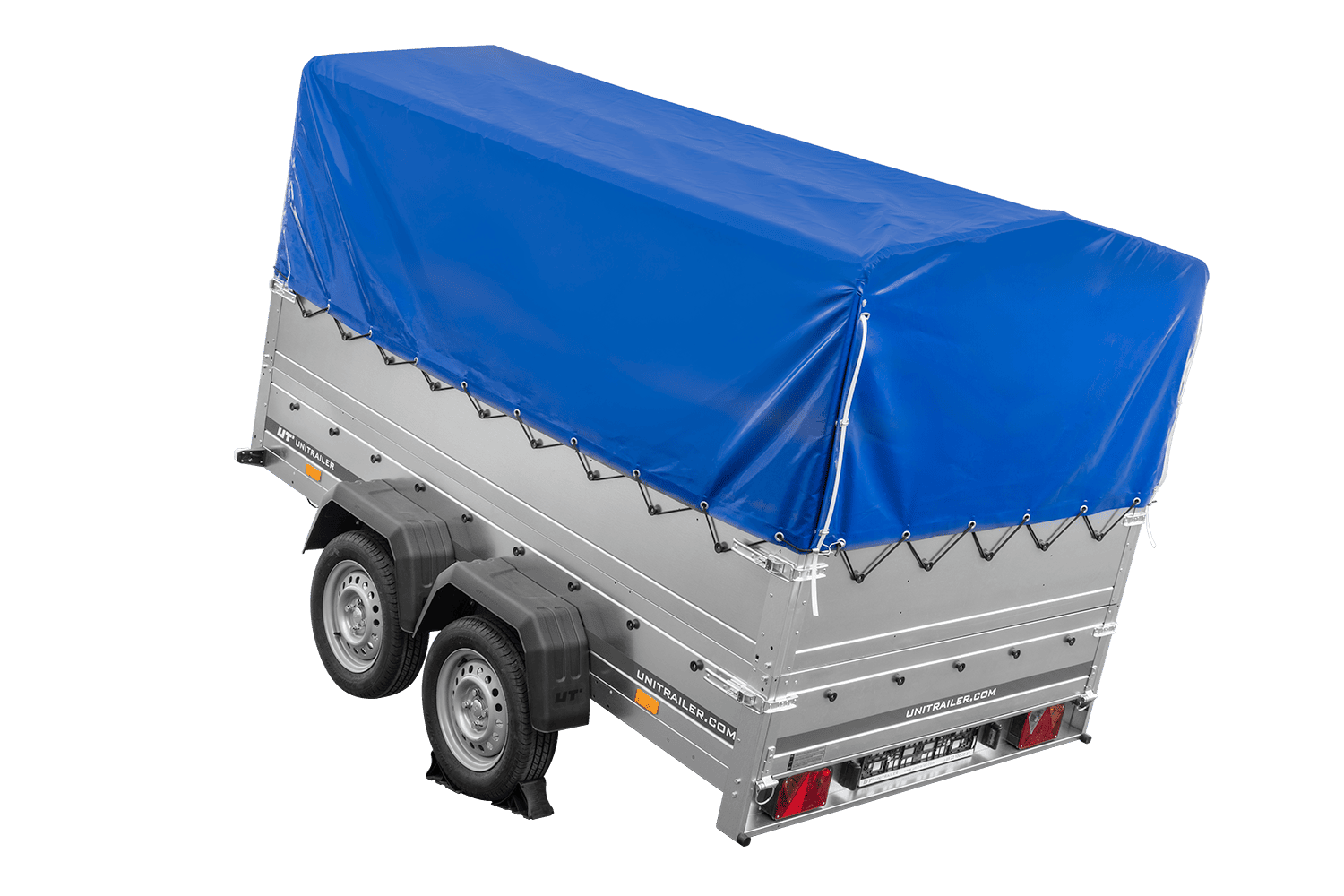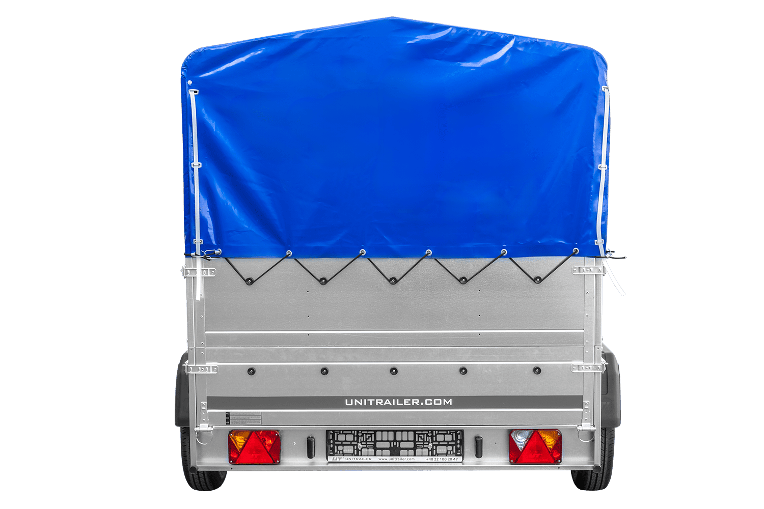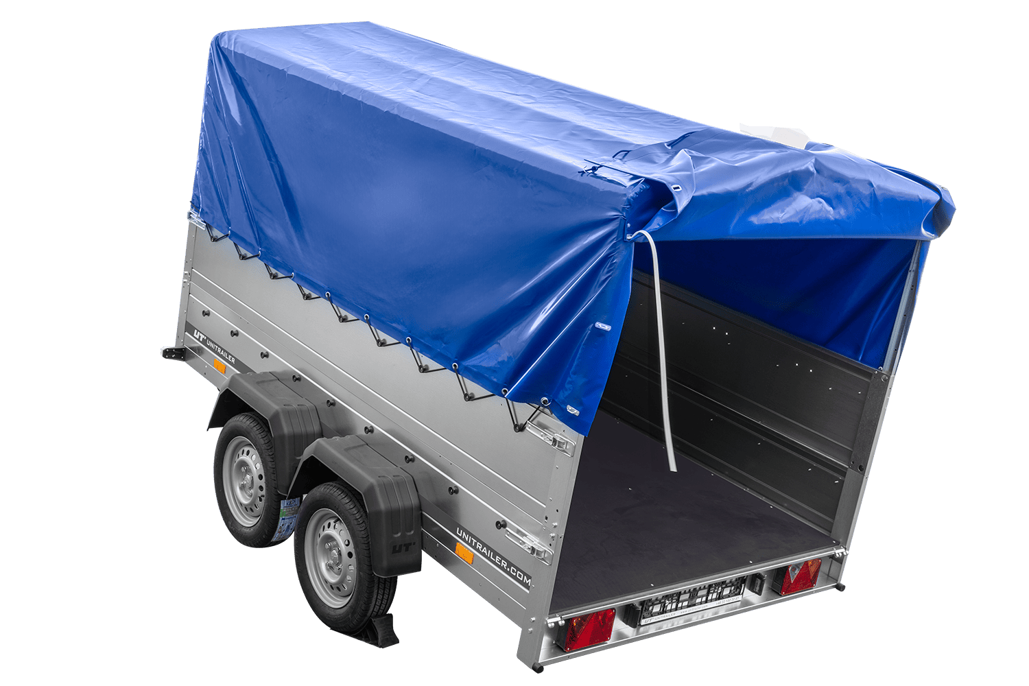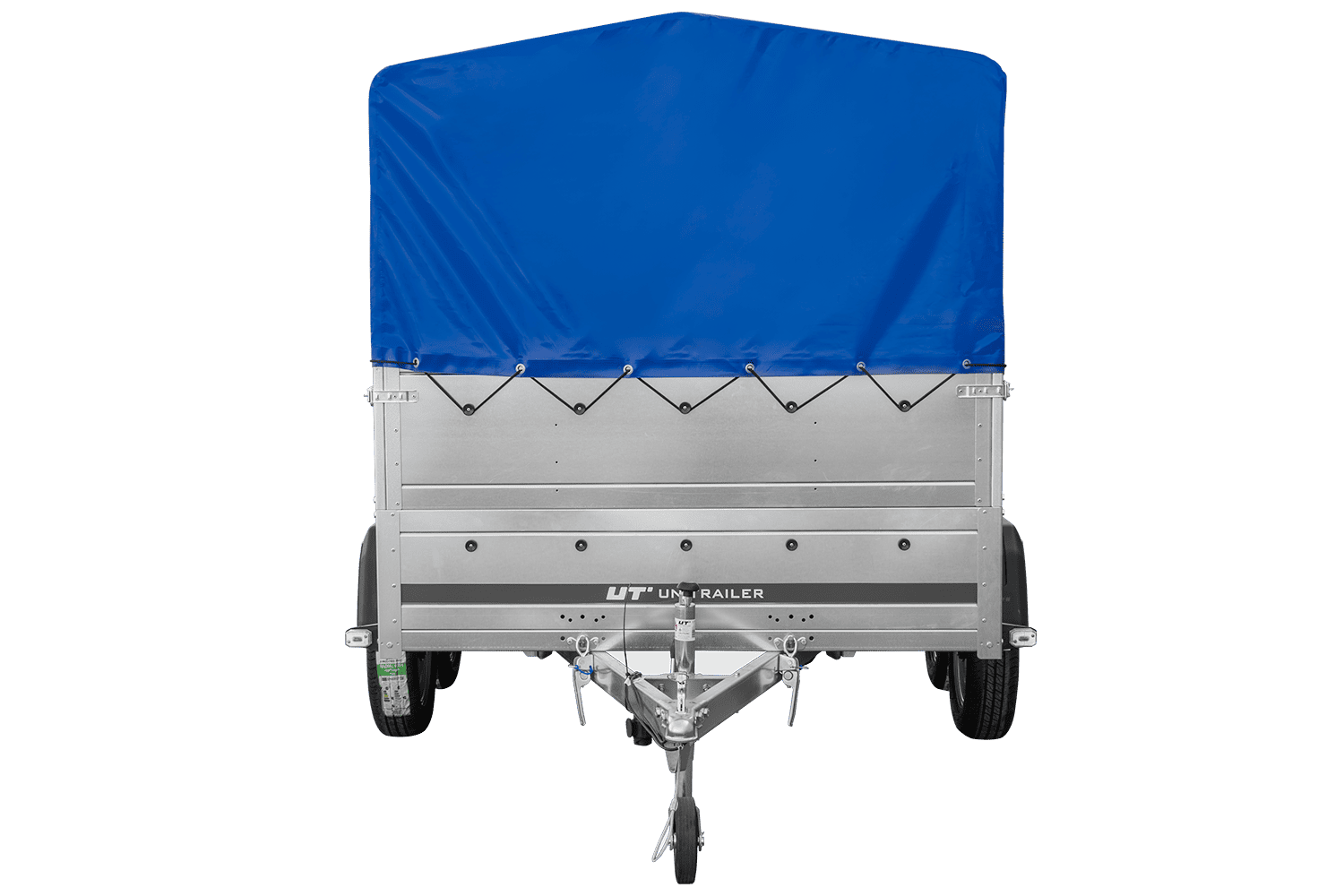 Tento přívěs s přídavnými bočními stěnami, 80 cm vysokým rámem a modrou plachtou je přívěs pro osobní automobil s maximální celkovou hmotností 750 kg . Pro snadné nakládání a vykládání má přívěs otevírací nebo odnímatelnou zadní stranu. Rám je v nejvyšším bodě vysoký 80 cm a má sedlovou střechu pro lepší odvod vody a sněhu během jízdy. Je vyroben z velmi pevných ocelových nosníků chráněných proti korozi pozinkováním. Rám je sestaven pomocí šroubů, které jsou součástí sady. Celá sestava vytváří pevný a stabilní rám pro plachtu. Plachta je vyrobena z silného, nepromokavého materiálu s gramáží 630 g/m² a ani dlouhodobý déšť nezpůsobí její prosakování. Součástí sady je také elastická šňůra s háčky, která umožňuje rychlé napnutí. Plachta je vybavena otevírací zadní částí , která usnadňuje nakládání a vykládání zboží z přívěsu. Pro přístup k nákladu nemusíte sundávat celou plachtu. Jednoduše zvedněte dva popruhy, které zajišťují zadní část plachty, abyste zabránili nechtěnému zvedání během jízdy nebo parkování. Pak jej jednoduše srolujte a umístěte na horní nosník rámu. To vám umožní snadný přístup do interiéru přívěsu, aniž byste museli otevírat zadní panel. Součástí dodávky je opěrné kolečko, které umožňuje pohodlné manévrování s přívěsem, když není připojen k vozidlu.