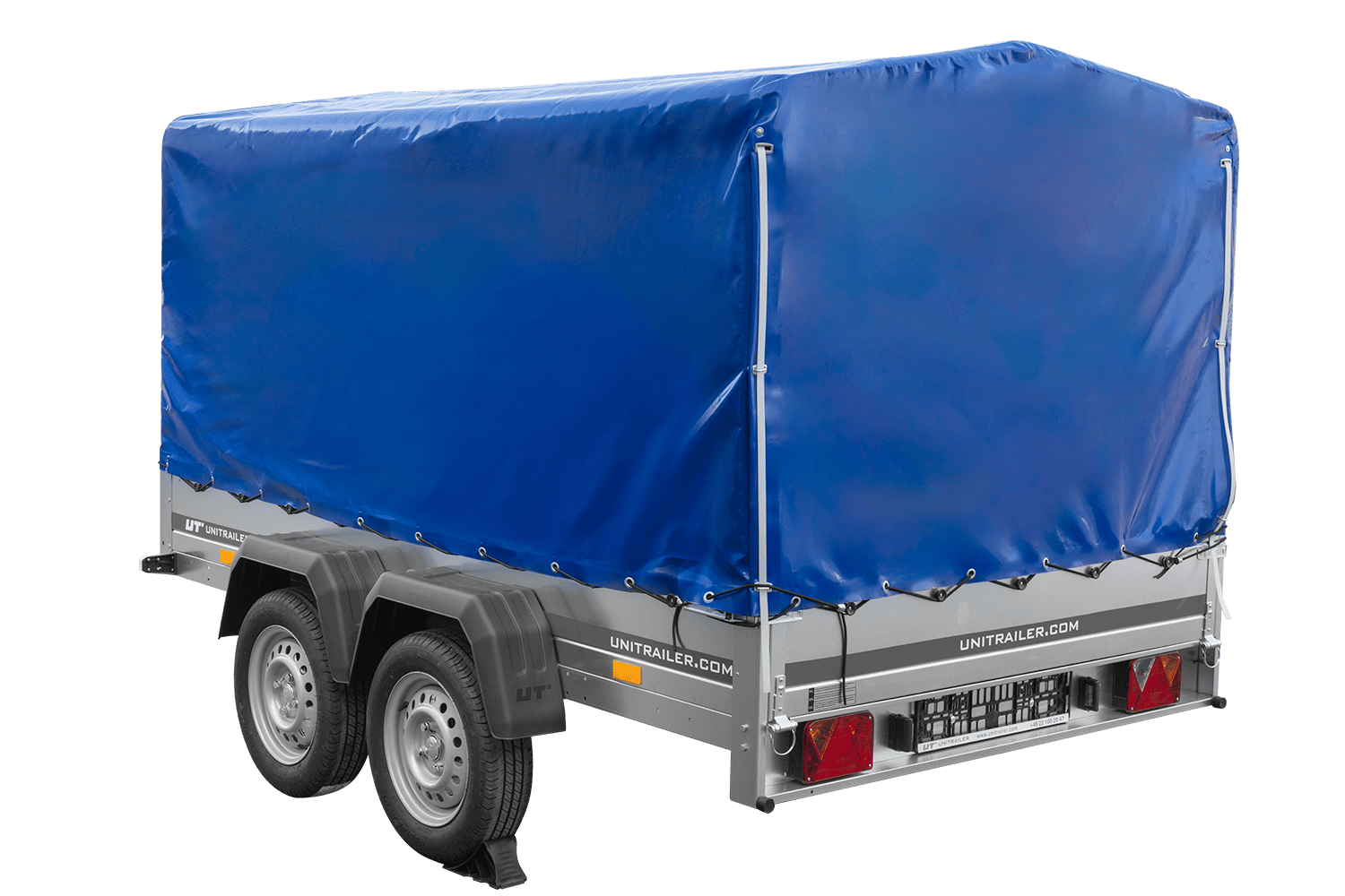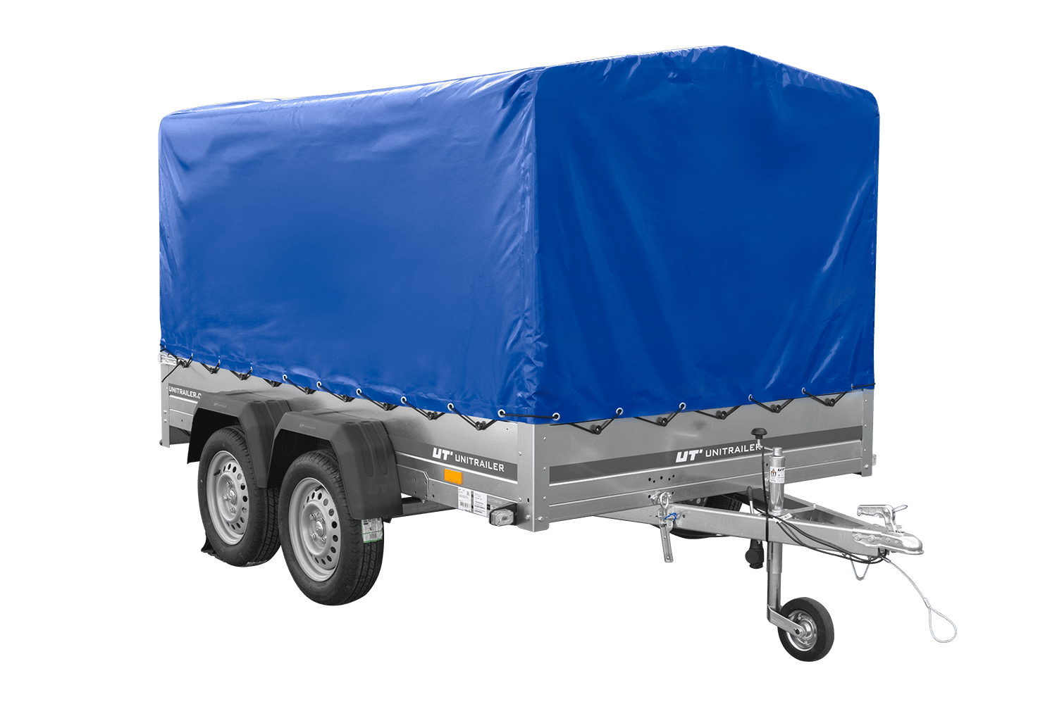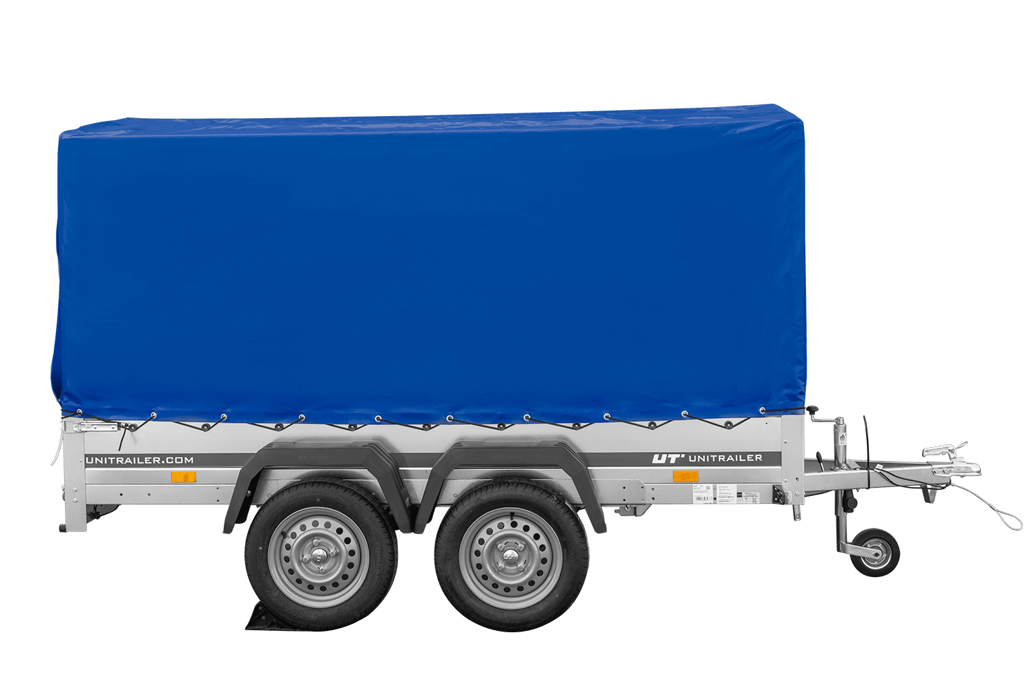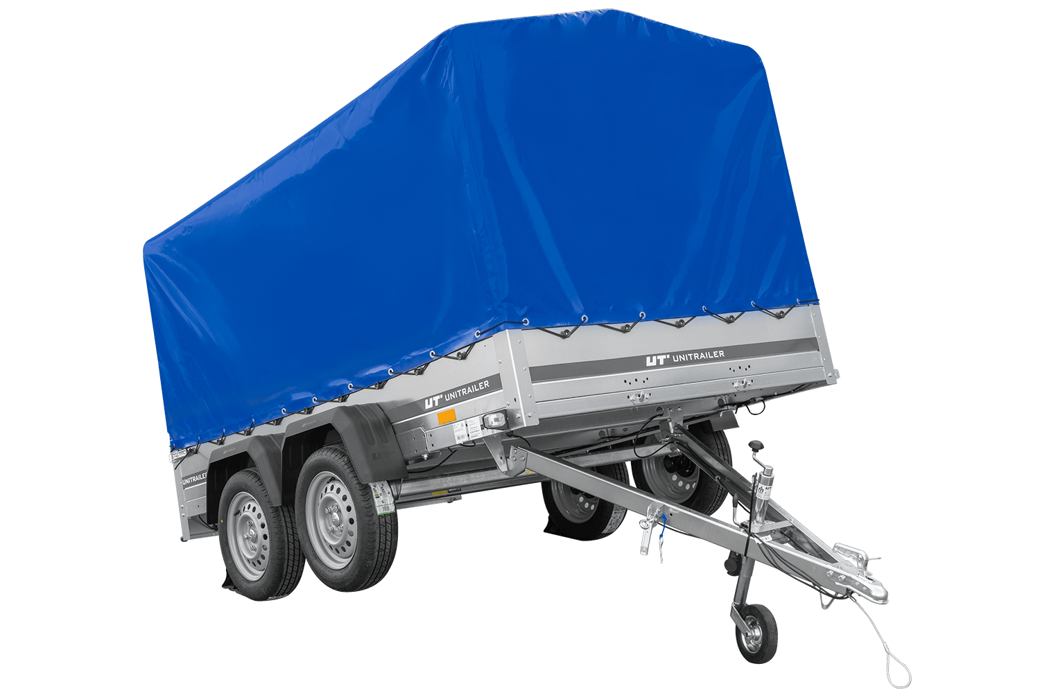 - Dvounápravový přívěs pro auto UNITRAILER Garden 265 Kipp, šířka 150 cm, s rámem H-1100 a modrým krytem. Ještě větší nákladový prostor vám umožní přepravit více zboží.