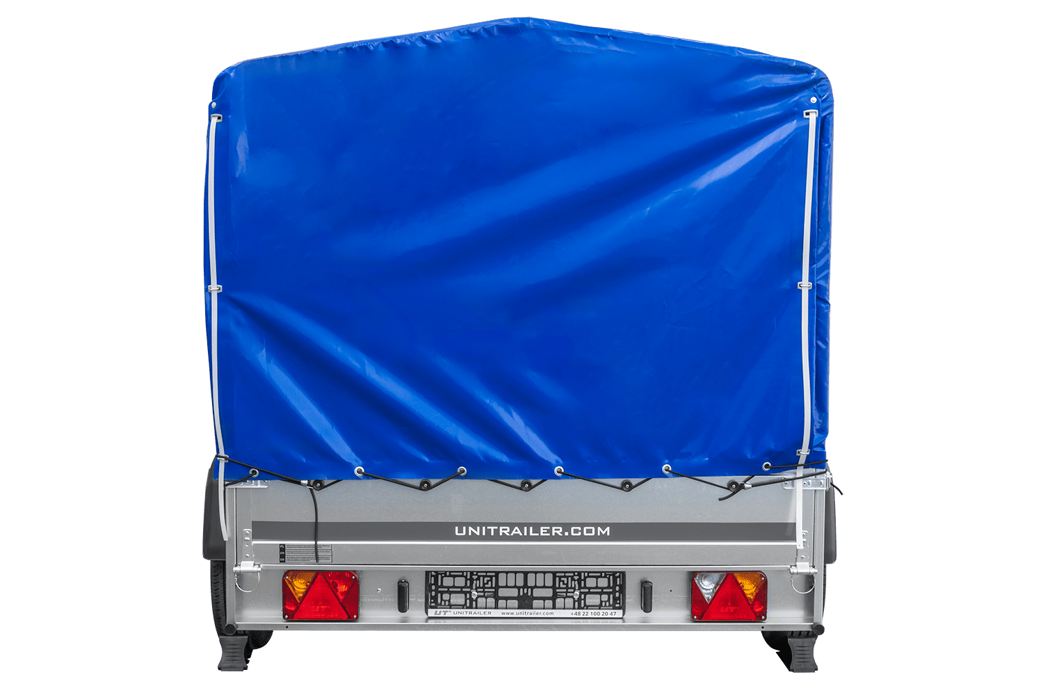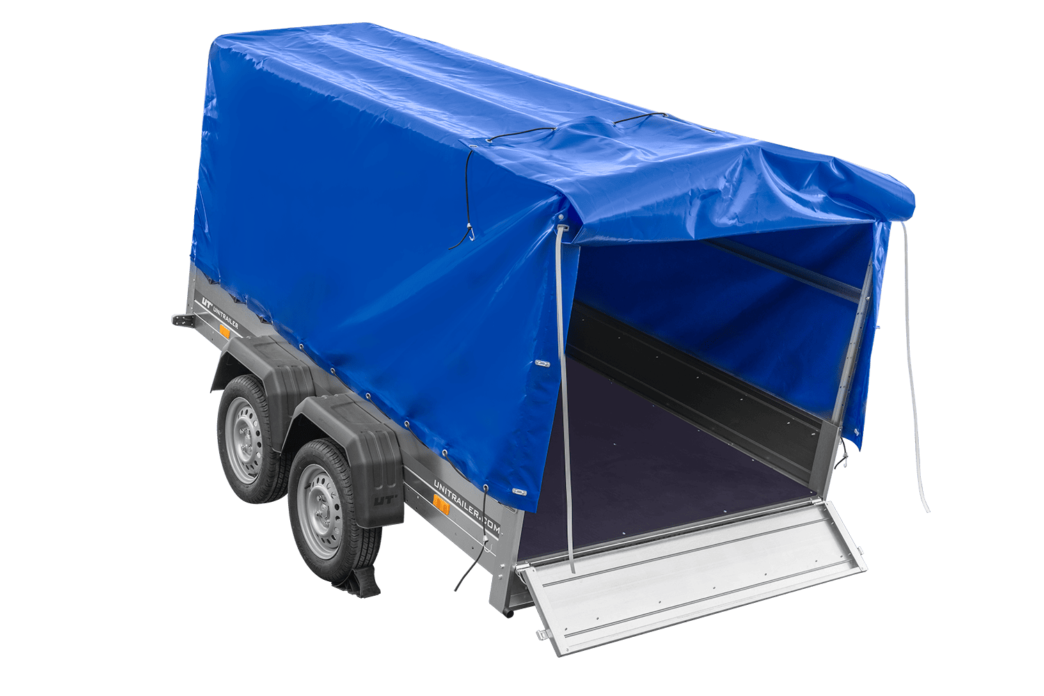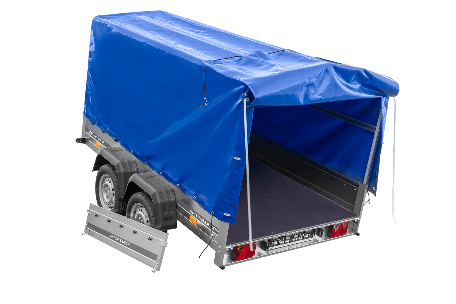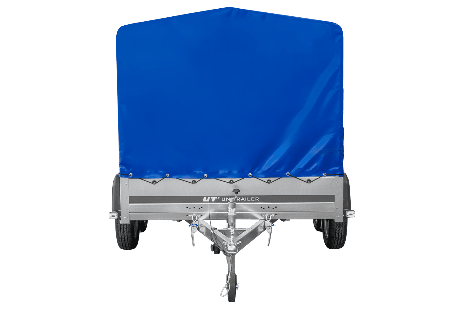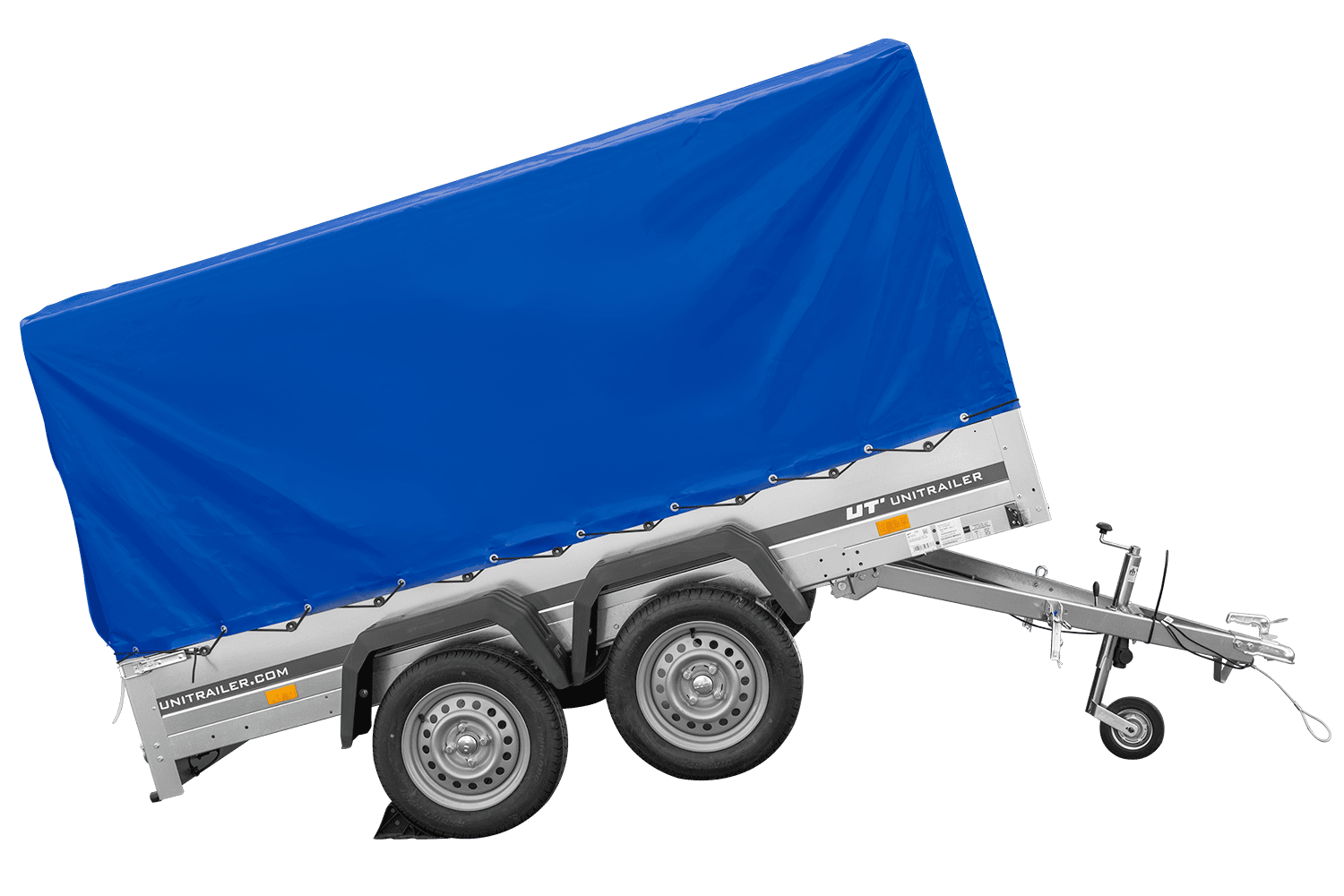 - Dvounápravový přívěs pro auto UNITRAILER Garden 265 Kipp, šířka 150 cm, s rámem H-1100 a modrým krytem. Ještě větší nákladový prostor vám umožní přepravit více zboží.