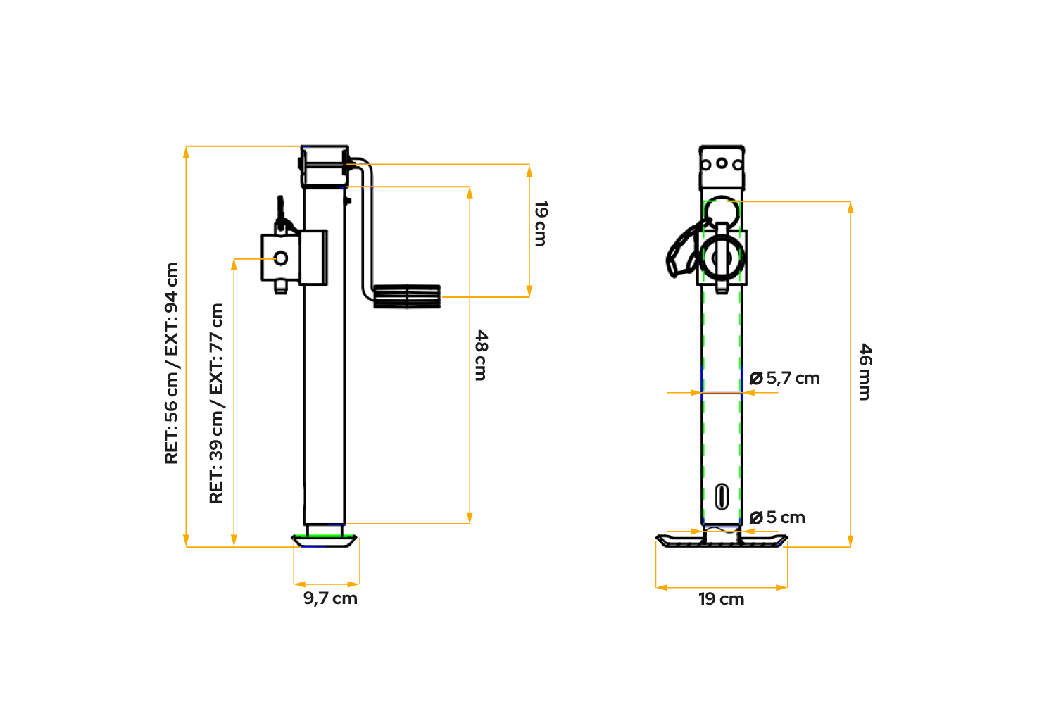 - Podpěra kliky TJ5002 má maximální nosnost 1300 kg a je nastavitelná od 220 do 370 mm, takže je ideální pro zemědělské, stavební a přepravní přívěsy. Zajišťuje stabilitu vozidla při parkování a chrání ho před nadměrným zatížením.