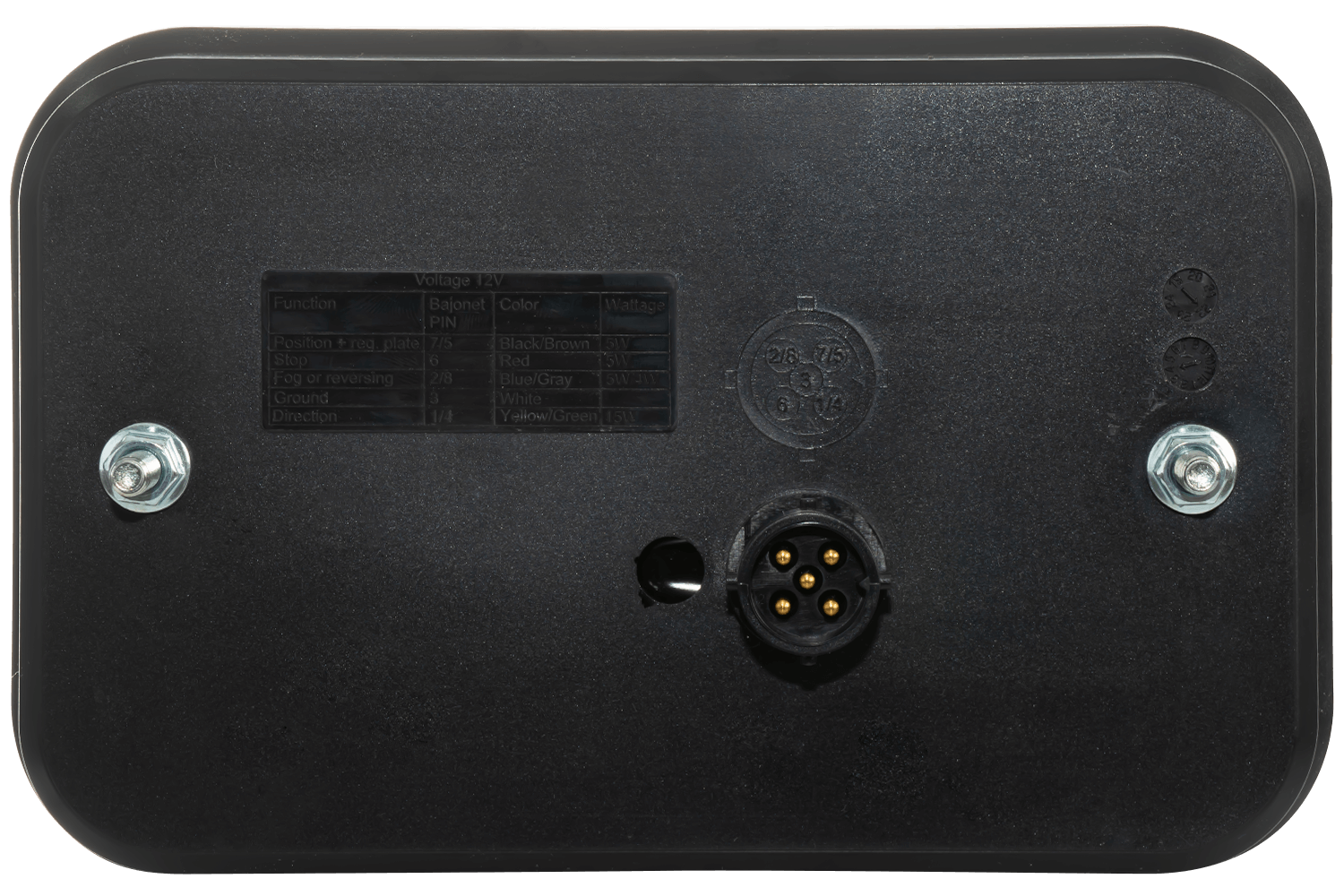 Kabeláž je vybavena dvěma 5pinovými bajonetovými konektory pro připojení zadních světel. Bajonetový systém zajišťuje rychlou a bezpečnou instalaci a eliminuje riziko náhodného odpojení během jízdy. Konstrukce konektoru zaručuje vodotěsné spojení a chrání kontakty před korozí, čímž zajišťuje dlouhodobý a bezproblémový provoz celého systému osvětlení přívěsu.