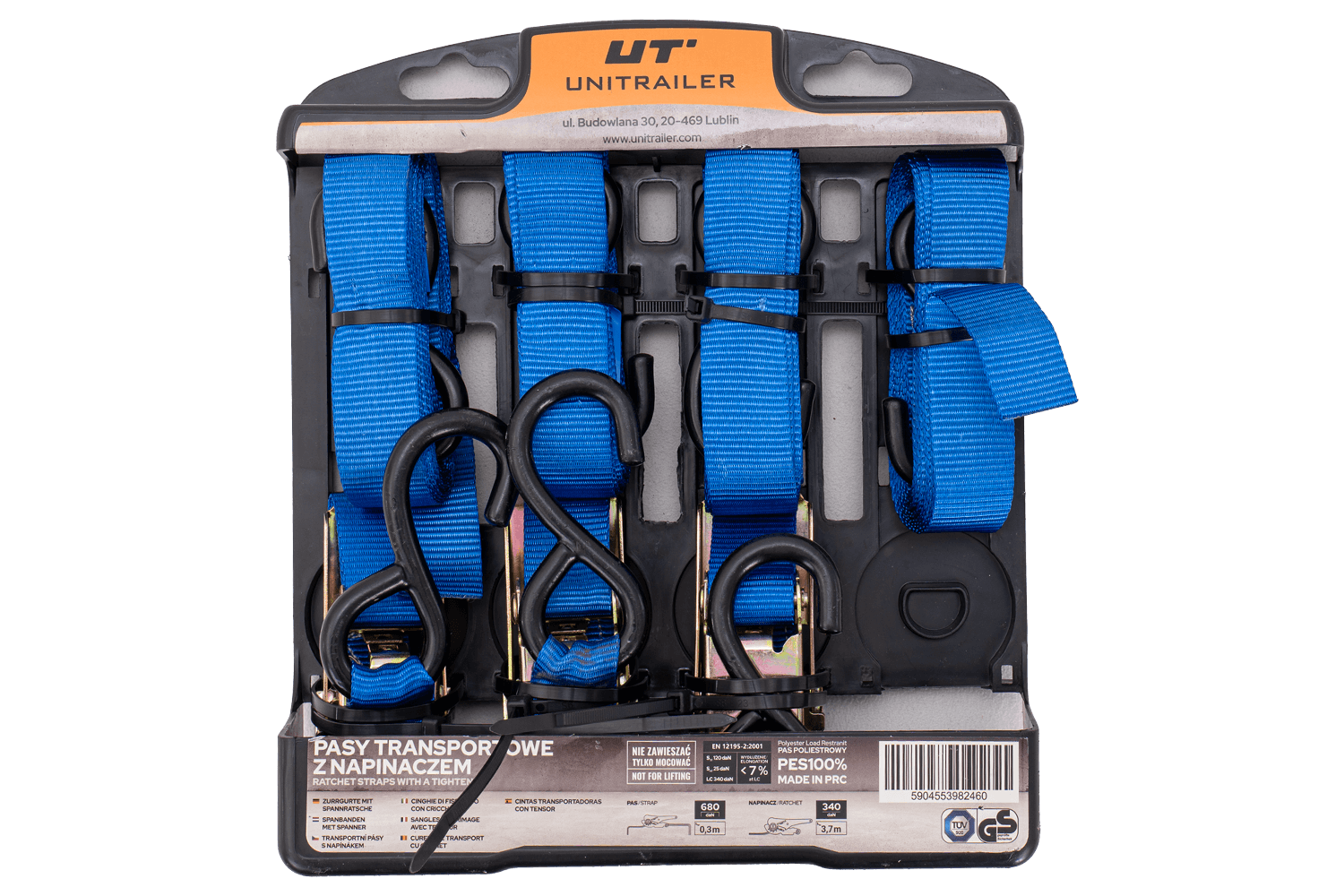 Sada čtyř modrých ráčnových popruhů UNITRAILER s napínači. Každý popruh se skládá ze dvou částí: kratší s ráčnou a hákem a delší s popruhem a hákem. Celková délka každého popruhu včetně popruhu a spony je 4 metry, což poskytuje dostatečnou délku pro různé přepravní aplikace. Šířka popruhu 25 mm poskytuje optimální upínací plochu. Každý popruh má pevnost v tahu 0,68 tuny (680 daN), díky čemuž je sada ideální pro bezpečné zajištění malých nákladů, jako je zahradní nářadí, lehké stavební materiály nebo dílenské vybavení během přepravy.