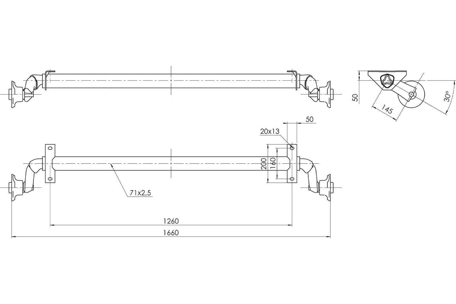 - Nebrzděná náprava pro přívěs AL-KO OPTIMA s maximální nosností 750 kg. Rozteč montážních otvorů je 1260 mm, rozteč nábojů je 1660 mm a rozteč šroubů je 4x100. Délka kyvné vidlice je 145 mm.