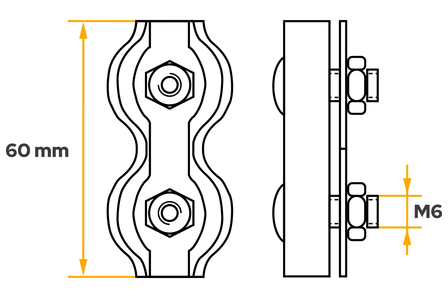 Lanová svorka ZLS.6 od firmy DROMET je dvojitá (sériová) sedlová svorka určená pro spojování, upevňování a upínání ocelových lan o průměru 6 mm . Je vybavena závitem M6 a celkovou délkou 60 mm , což umožňuje stabilní a rovnoměrné uchycení lana ve dvou bodech, což zvyšuje odolnost a jistotu upevnění. Díky sedlové konstrukci svorka zajišťuje rychlou montáž a dobré uchycení v systémech vyžadujících větší přítlačnou plochu.