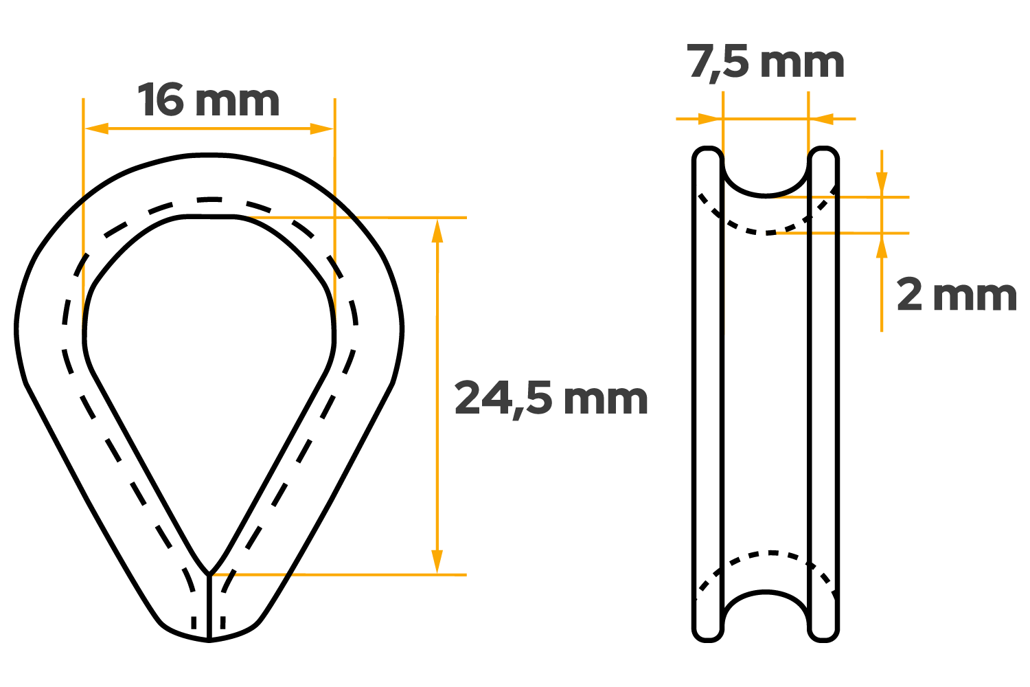 Ochranný očko KU.6 od firmy DROMET je pevný ochranný tvar určený pro lana o průměru 6 mm . Jeho rozměry a provedení odpovídají německé normě DIN 6899B , což zajišťuje přesné uchycení a vysokou funkčnost. Očko má profilovaný žlábek , do kterého lano zasouvá přibližně do 2/3 svého průměru, což umožňuje bezpečné a stabilní umístění. Díky tomu jej lze použít jak k opletení a krimpování, tak i k zaplétání do struktury lana.